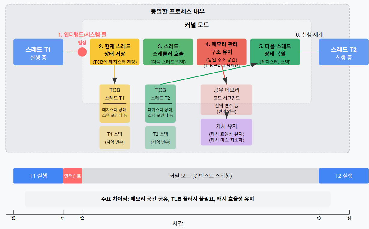 - 프로세스 컨텍스트 스위칭과 달리, 동일한 프로세스 내에서 스레드 간 전환이므로 메모리 주소 공간은 변경되지 않는다.